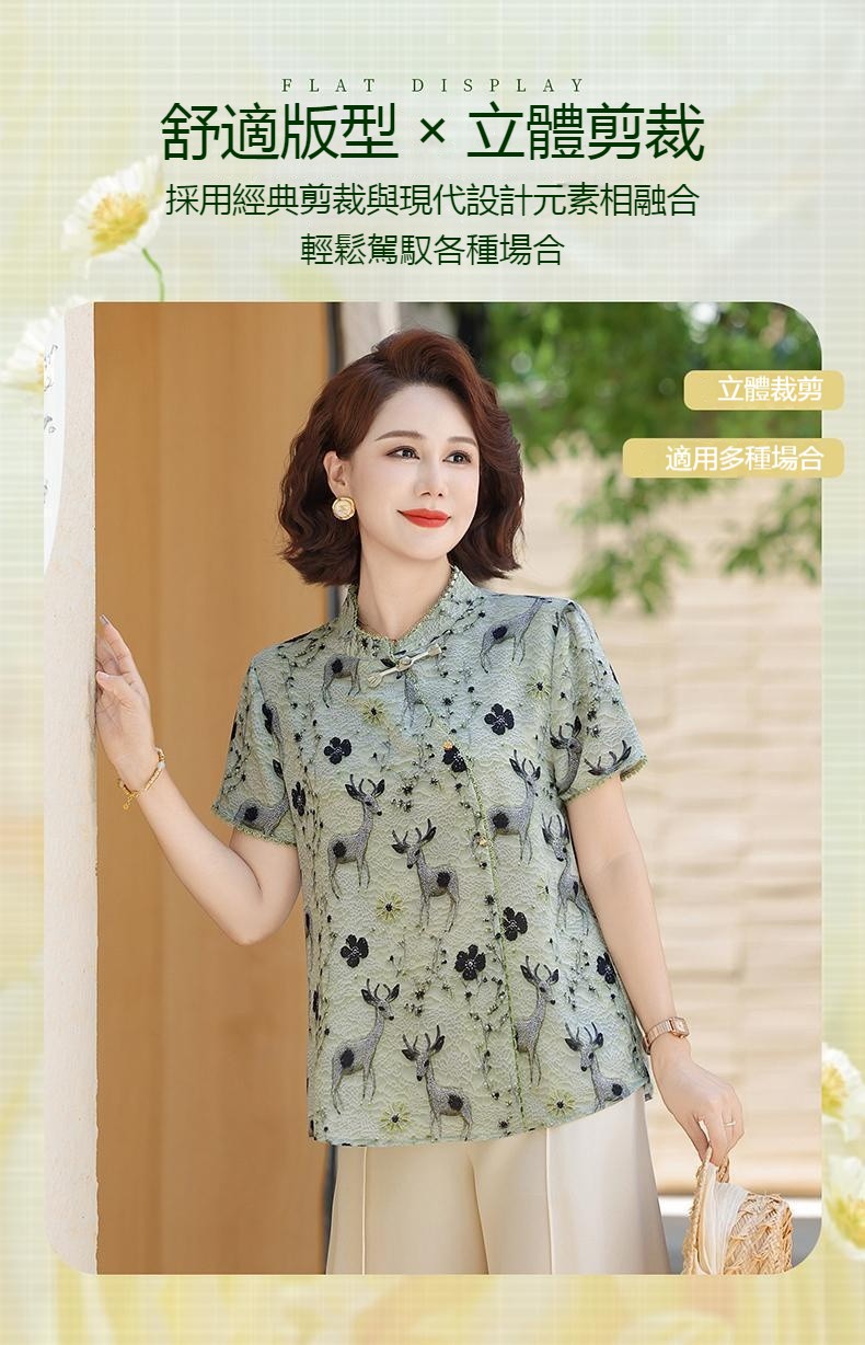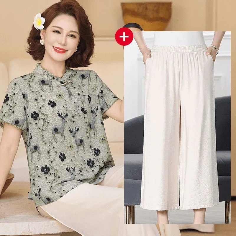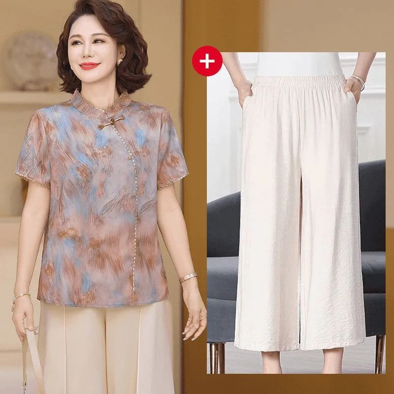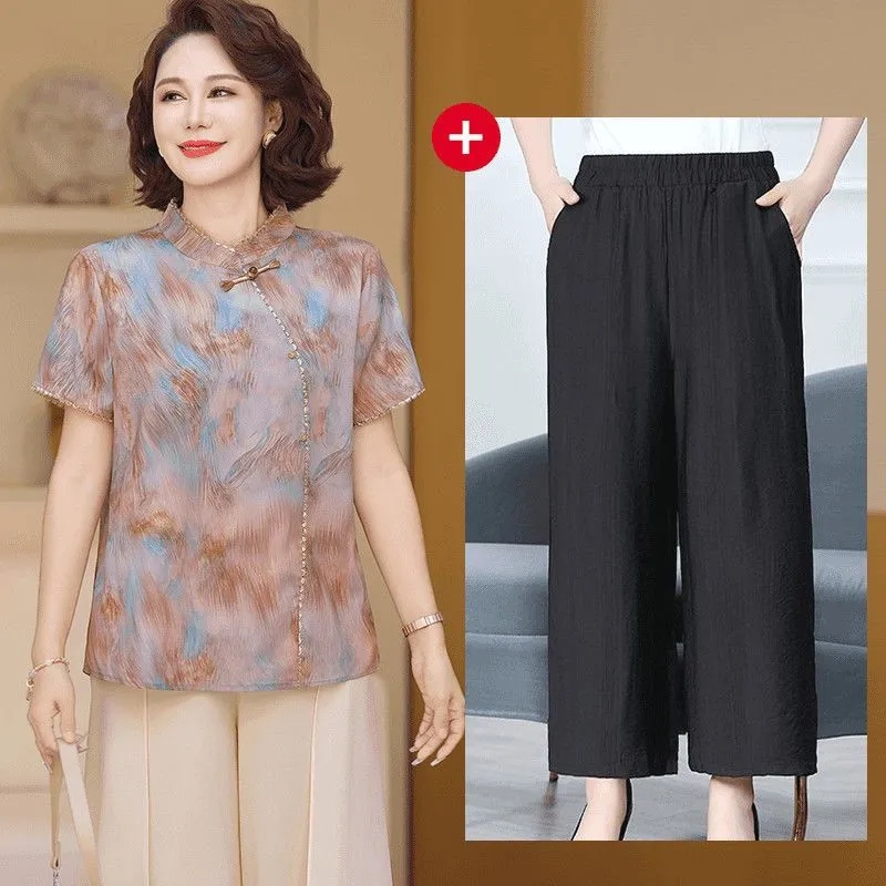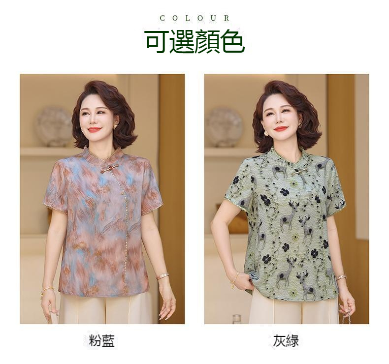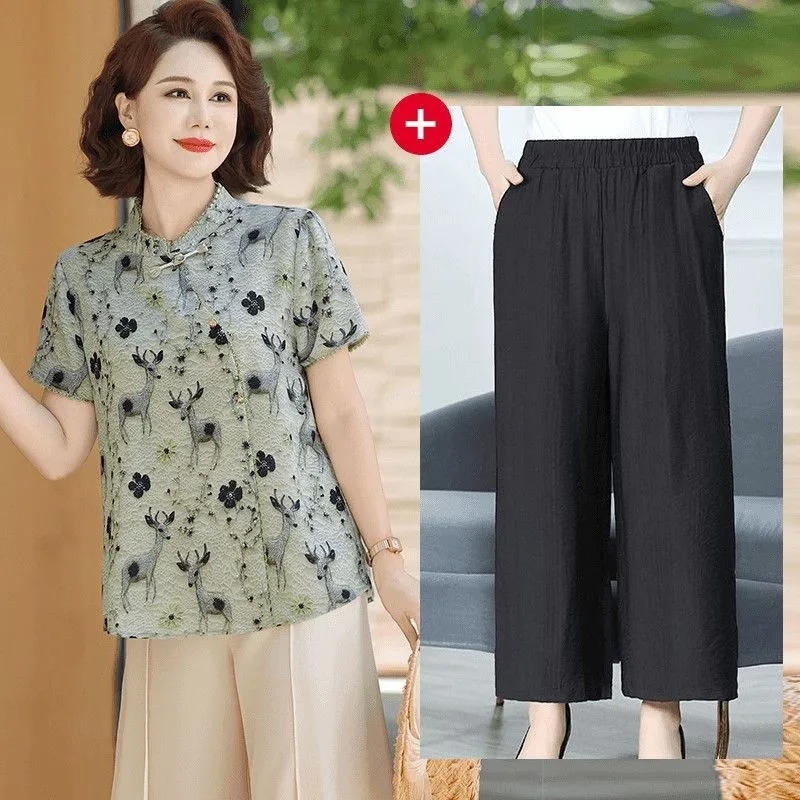 2025優雅氣質媽媽夏季高檔雙絲皺短袖小衫上衣+褲子兩件組,大尺碼寬鬆,顯瘦減齡