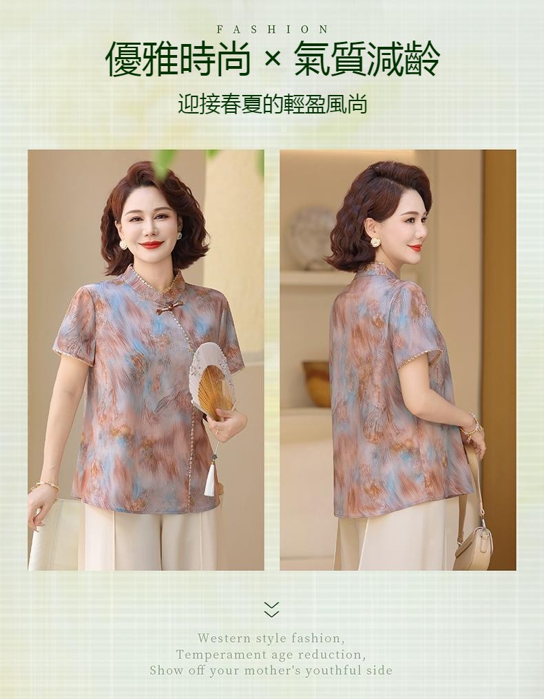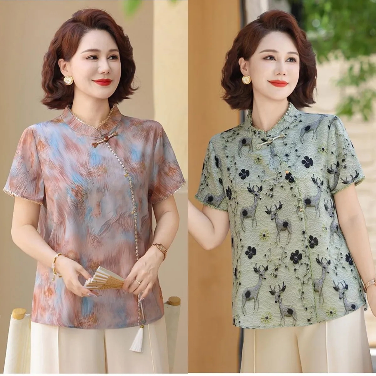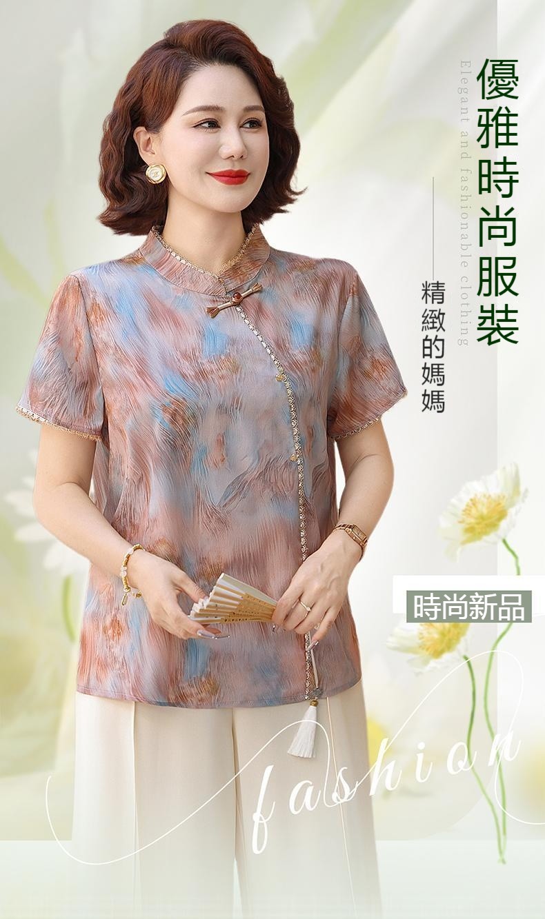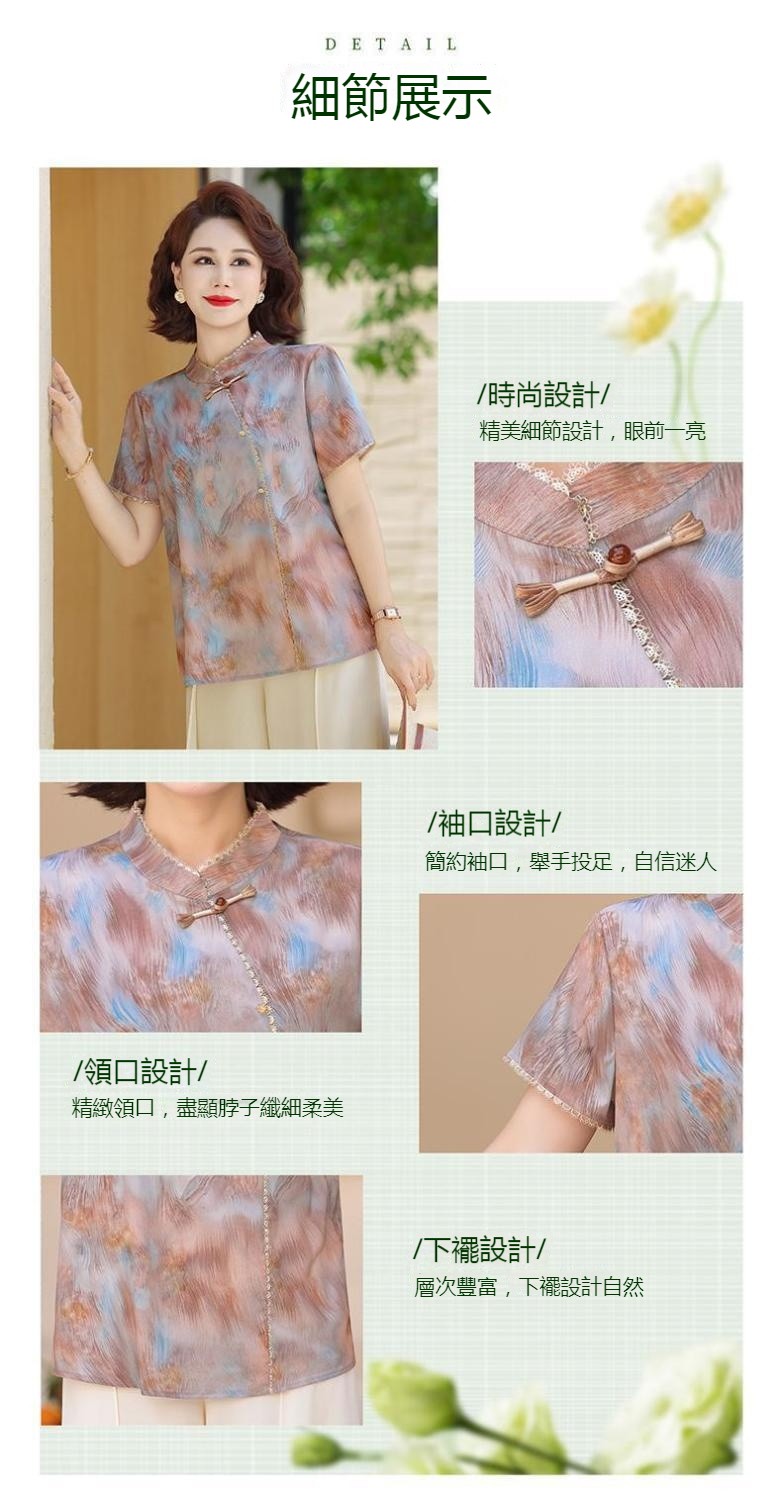2025優雅氣質媽媽夏季高檔雙絲皺短袖小衫上衣+褲子兩件組,大尺碼寬鬆,顯瘦減齡