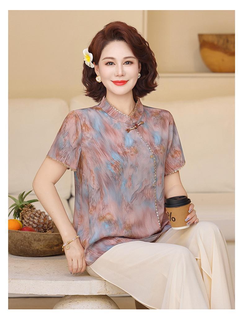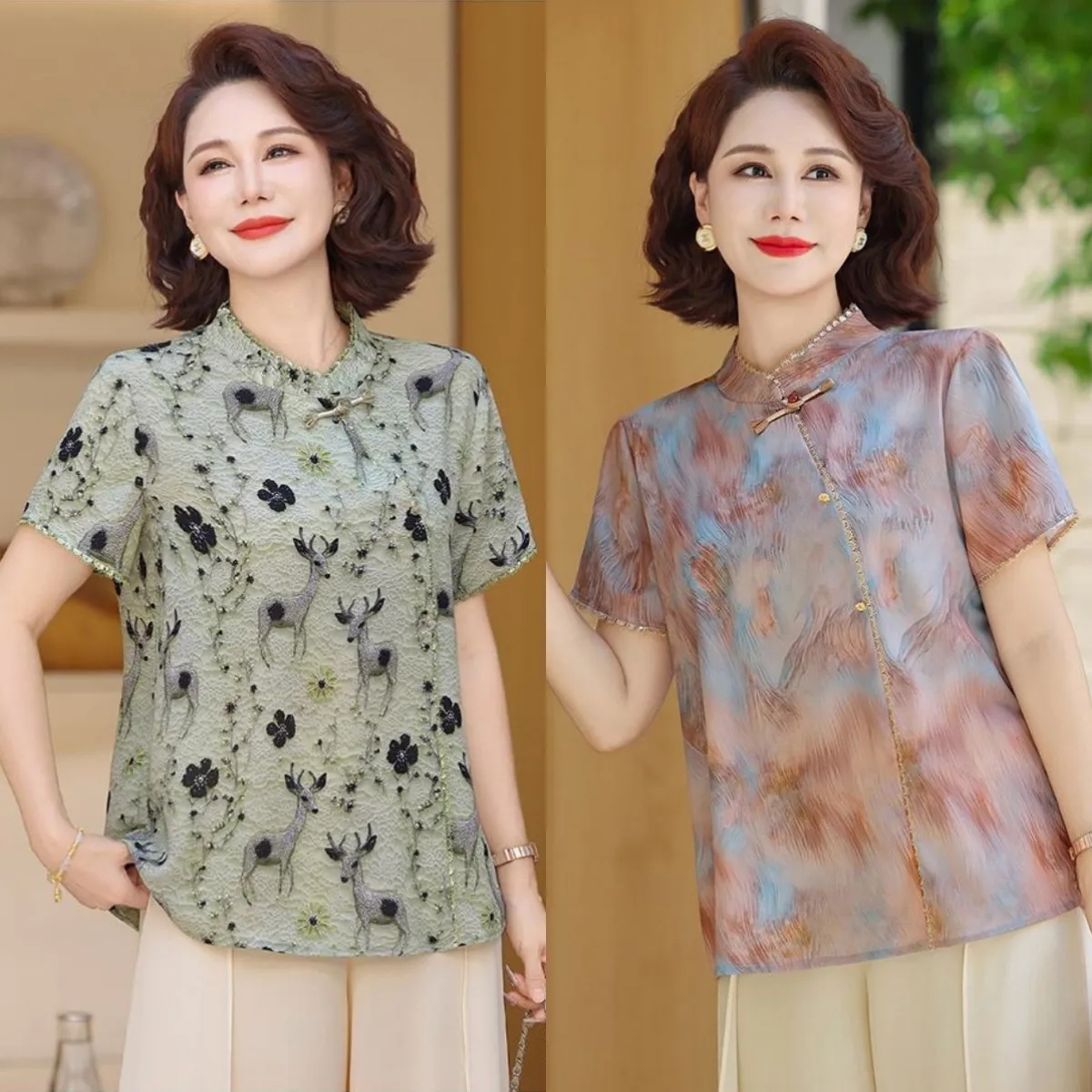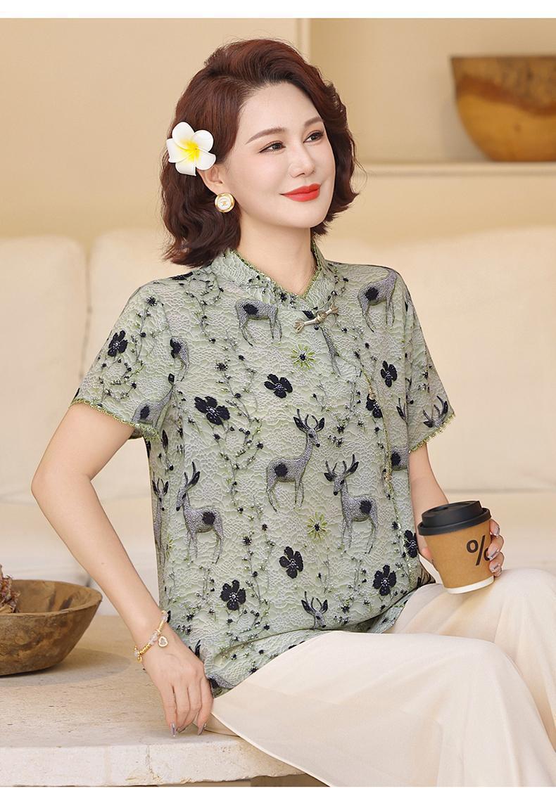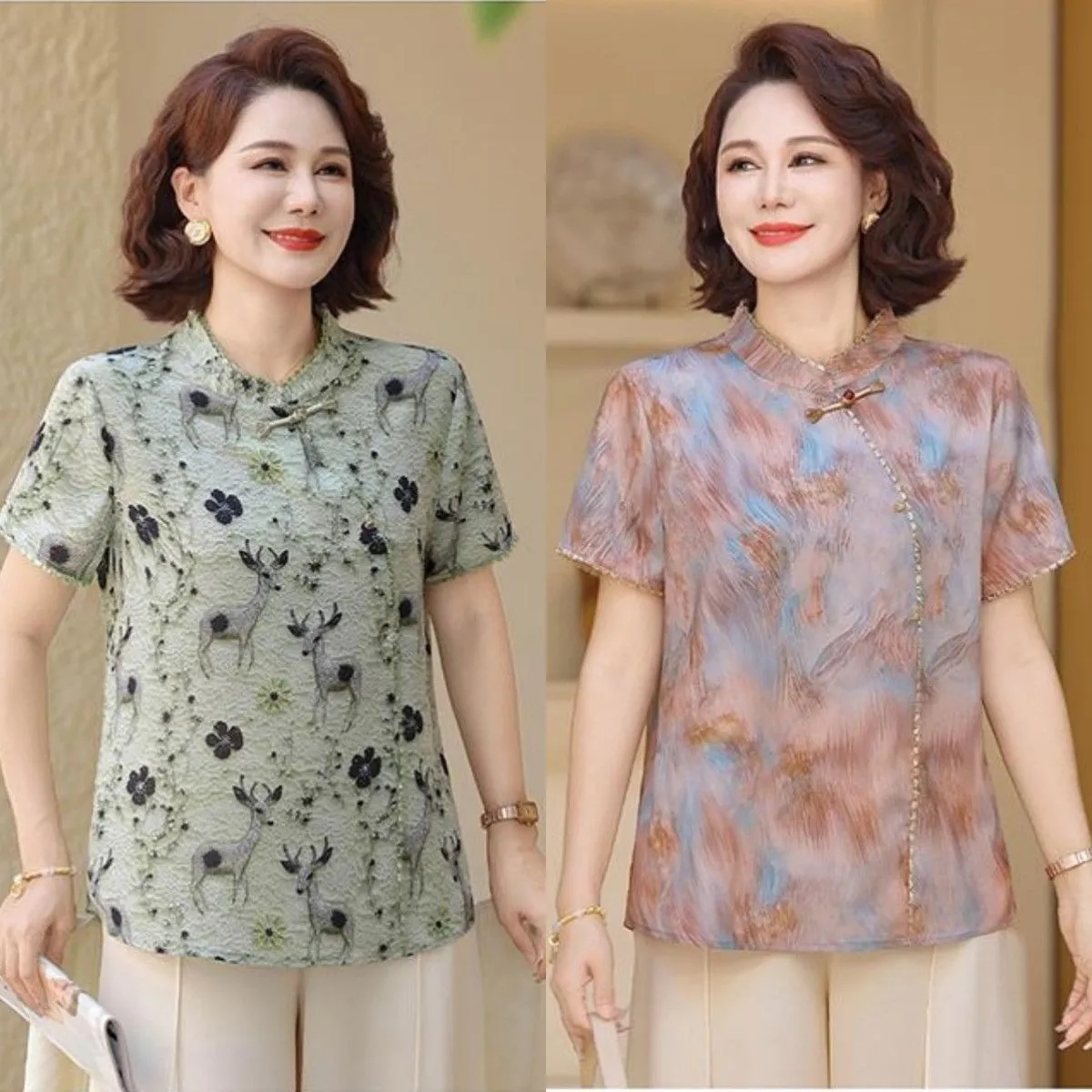 2025優雅氣質媽媽夏季高檔雙絲皺短袖小衫上衣+褲子兩件組,大尺碼寬鬆,顯瘦減齡