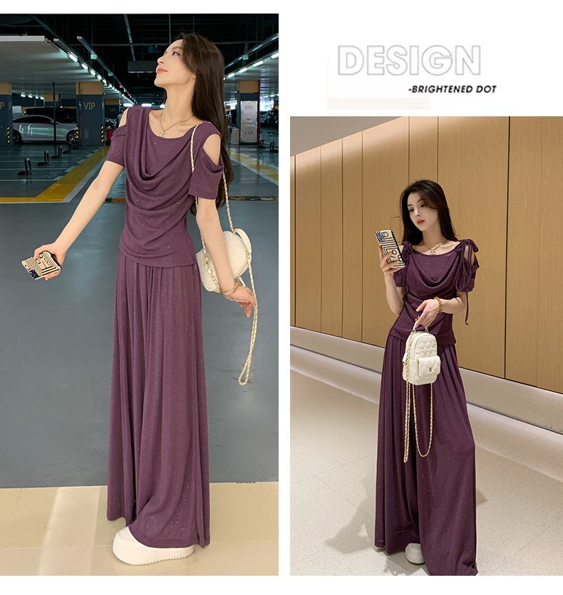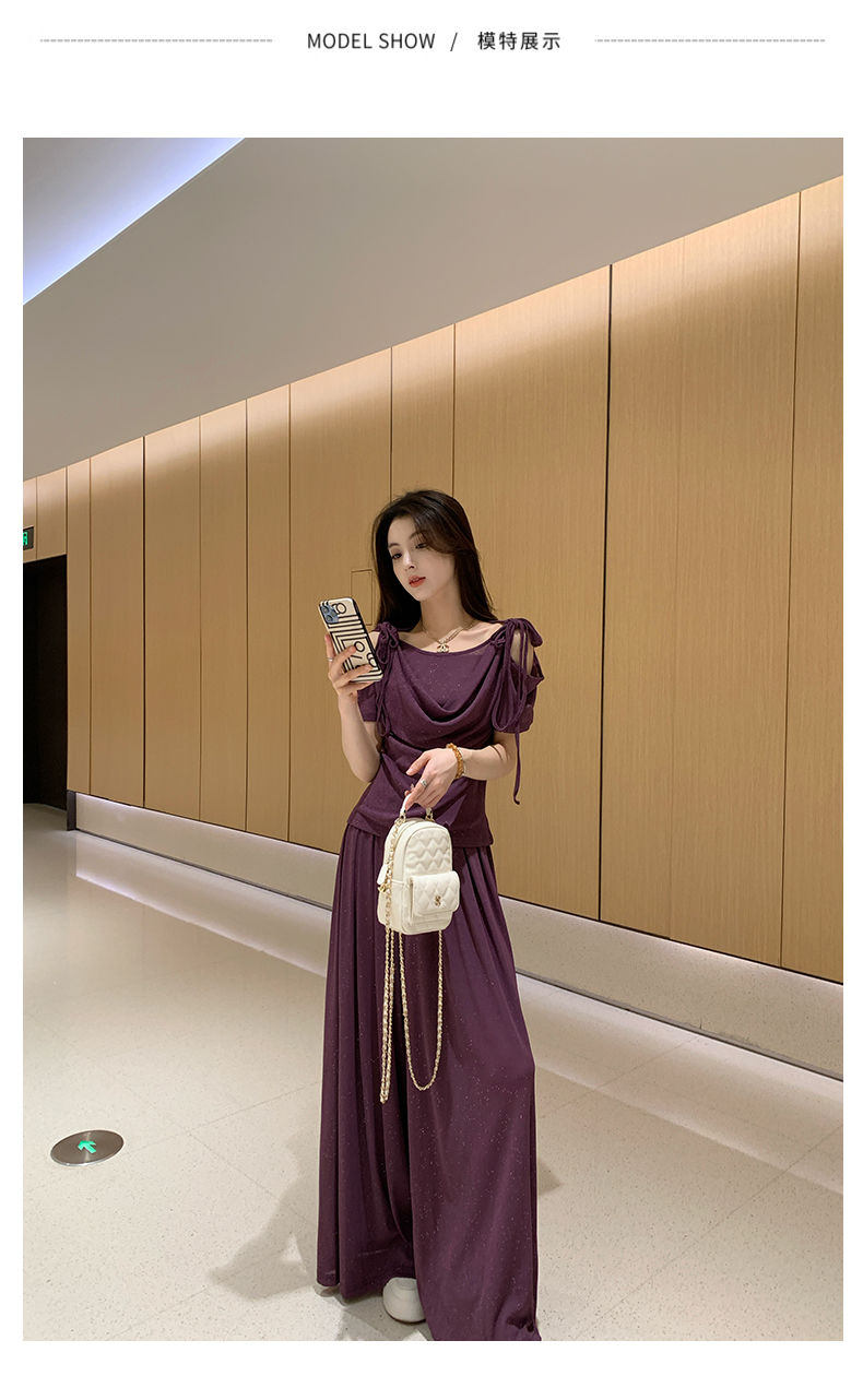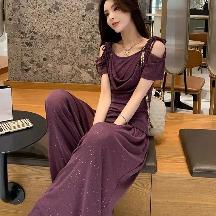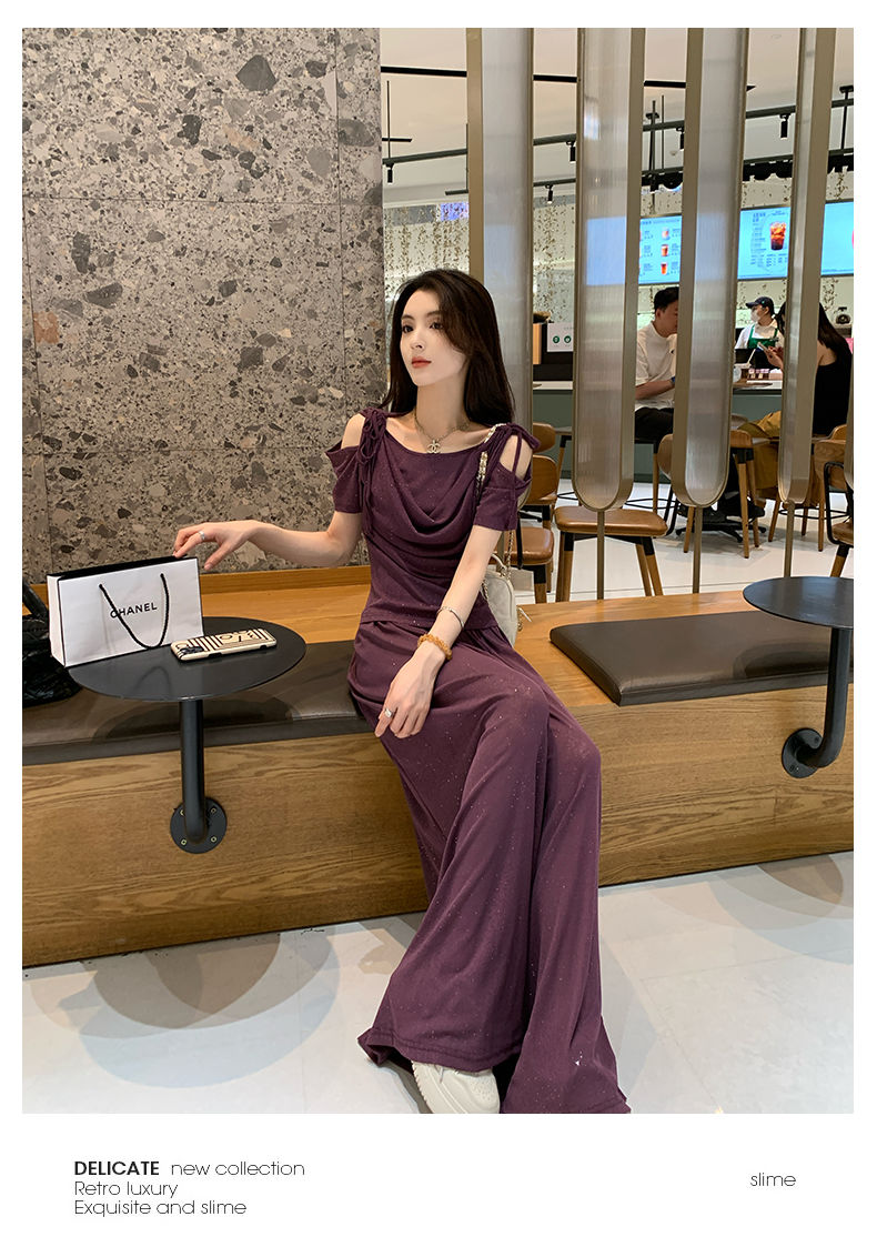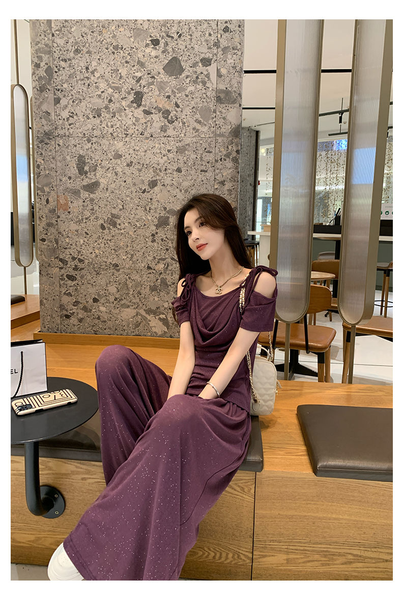 2025年新款夏季休閒時尚細閃露肩綁帶上衣+寬鬆顯瘦闊腿褲,超垂墜感,柔軟彈力