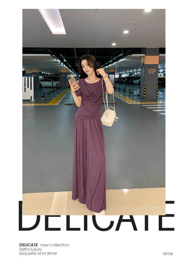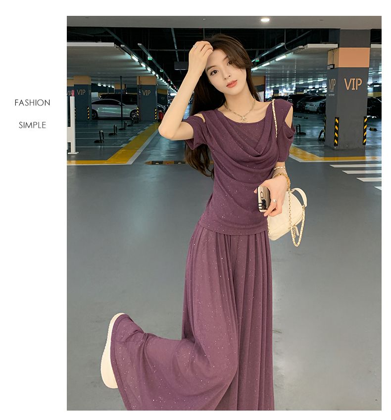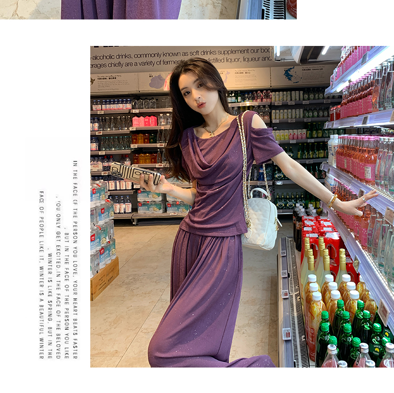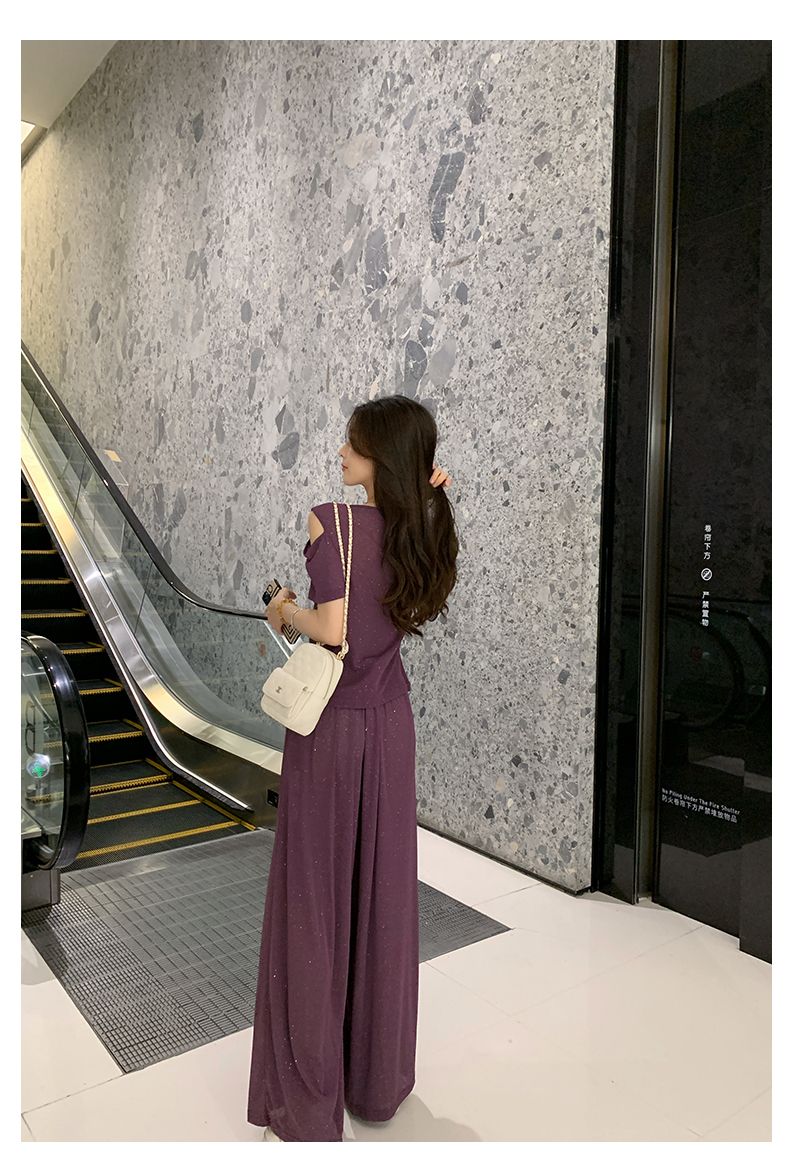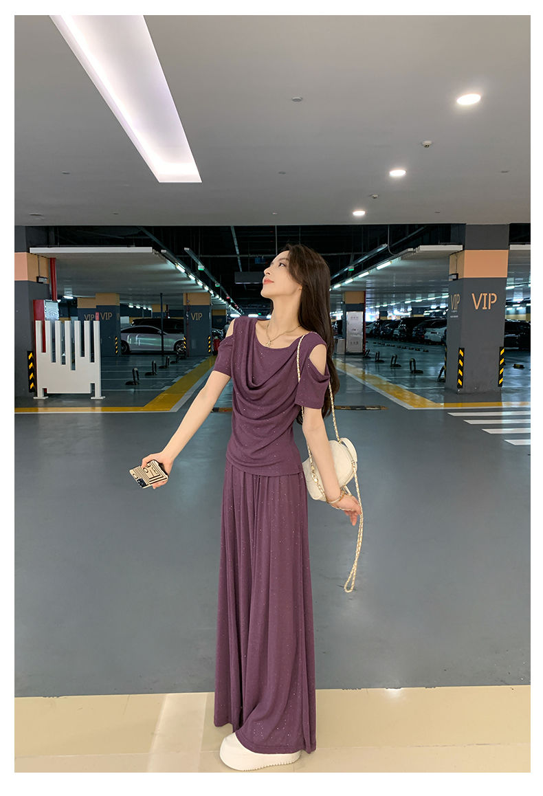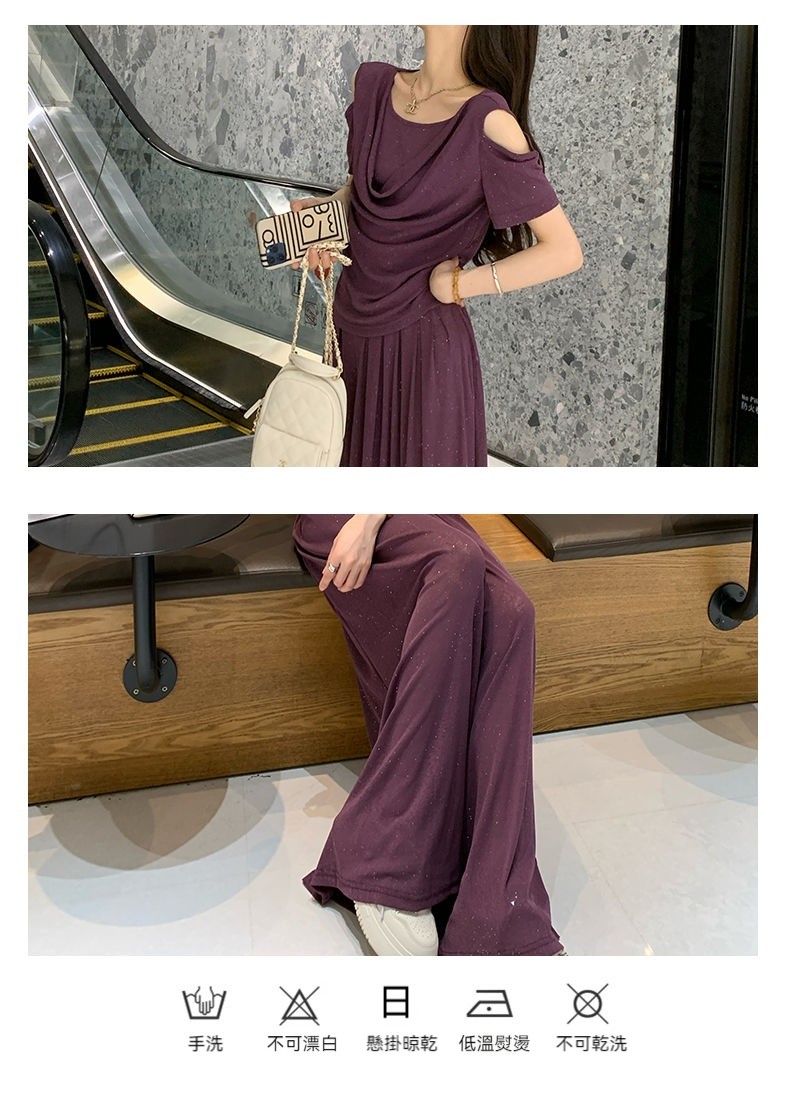 2025年新款夏季休閒時尚細閃露肩綁帶上衣+寬鬆顯瘦闊腿褲,超垂墜感,柔軟彈力