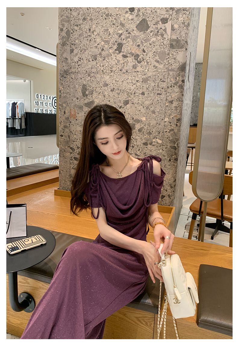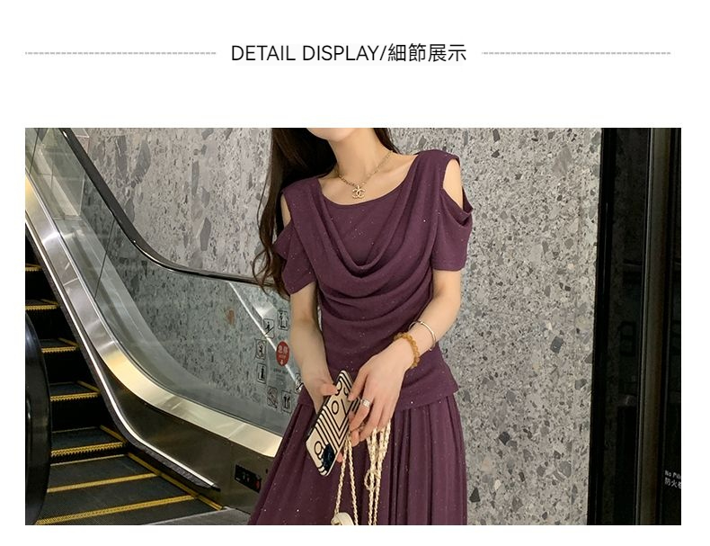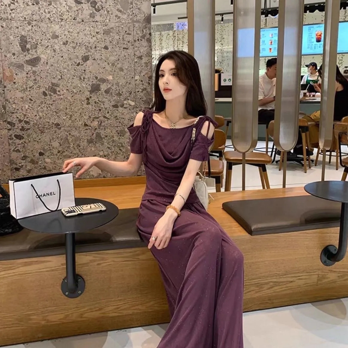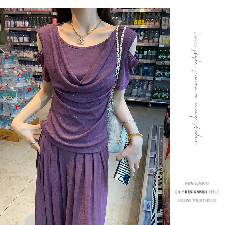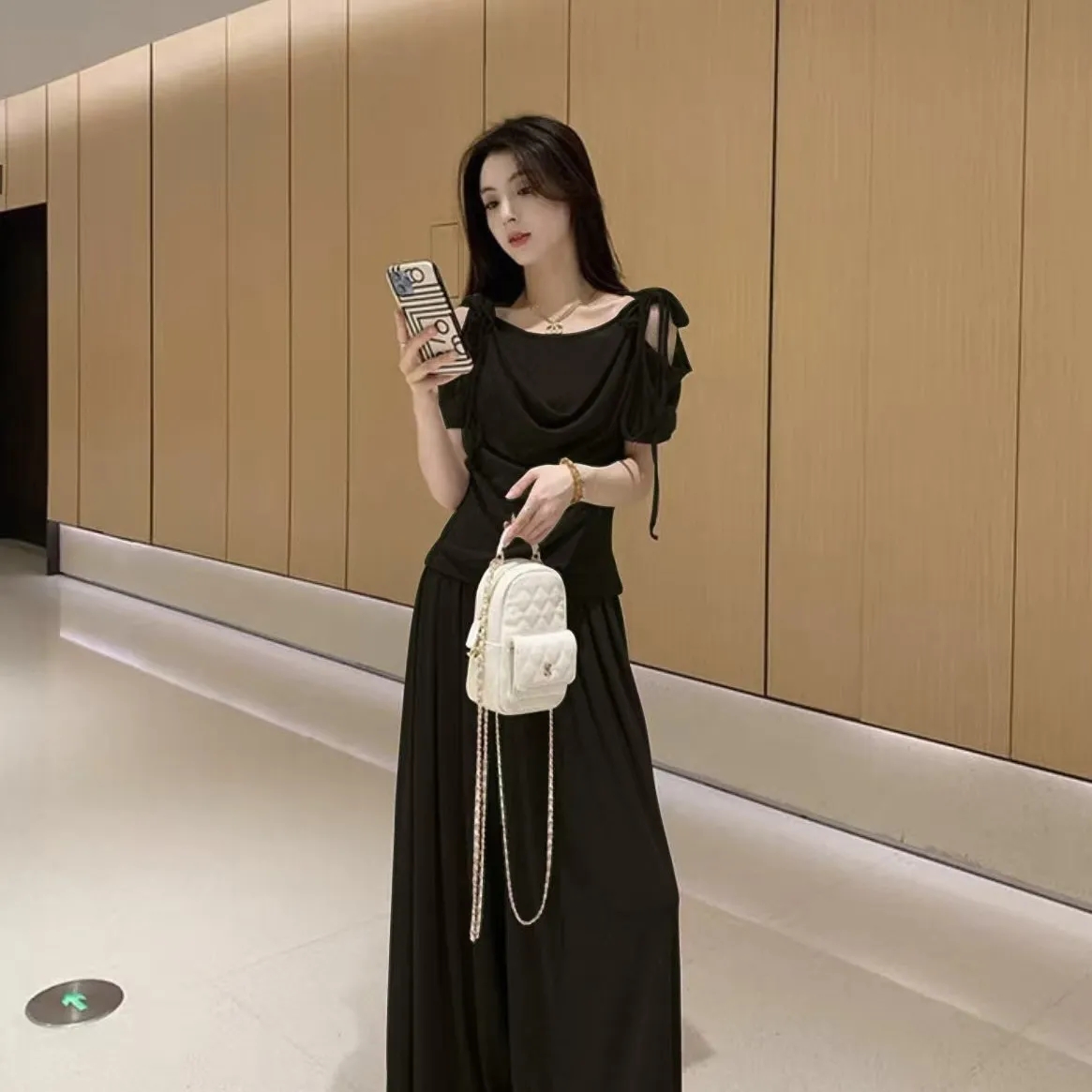 2025年新款夏季休閒時尚細閃露肩綁帶上衣+寬鬆顯瘦闊腿褲,超垂墜感,柔軟彈力