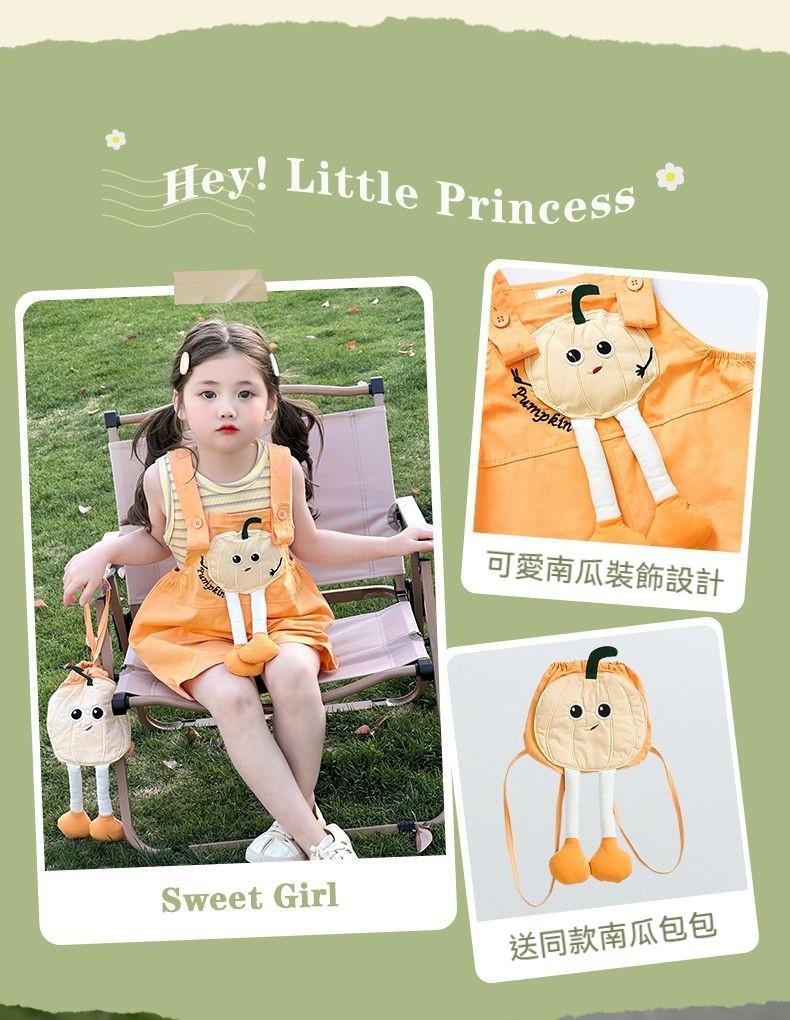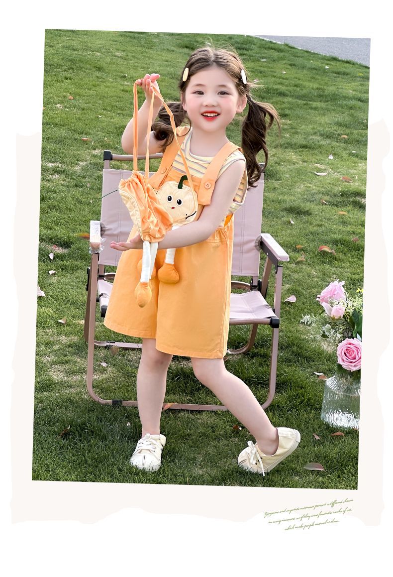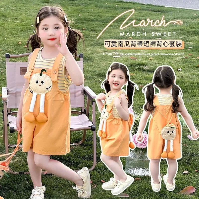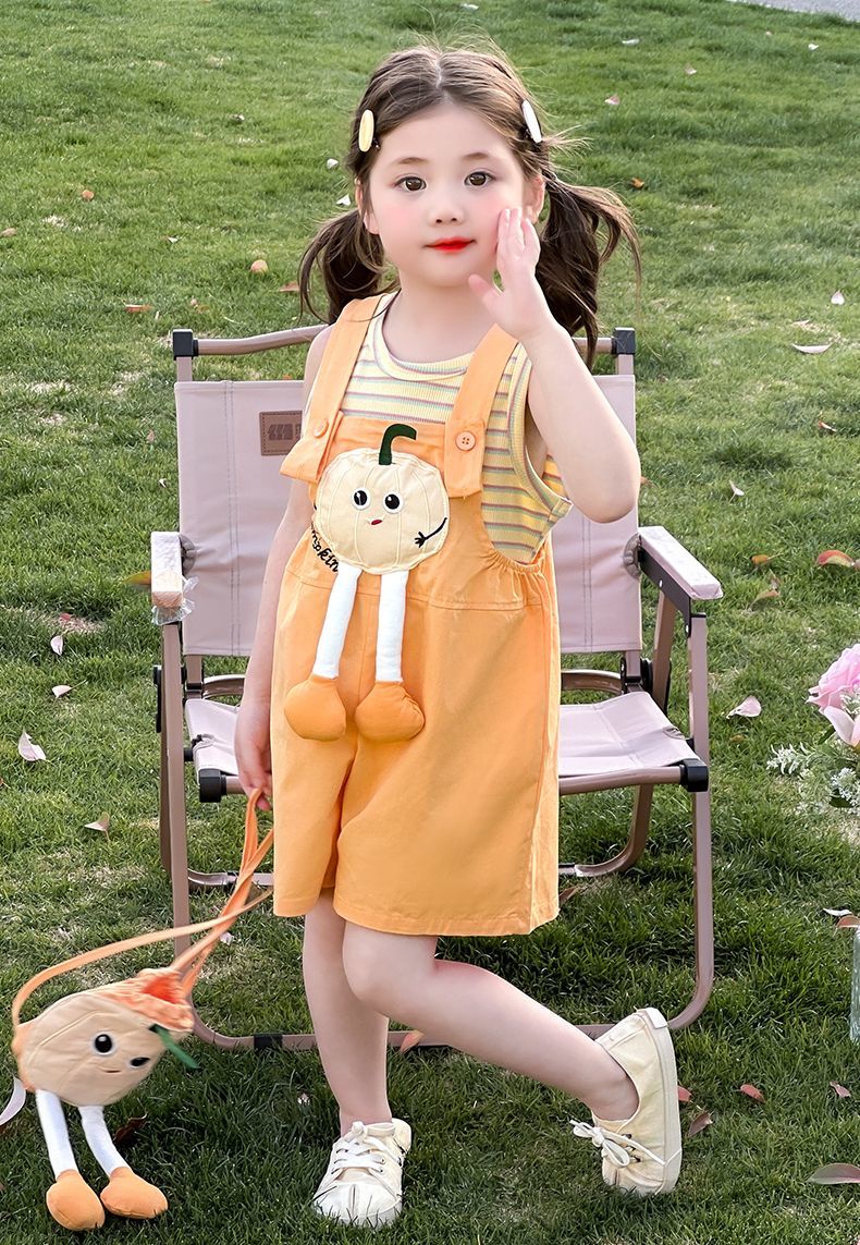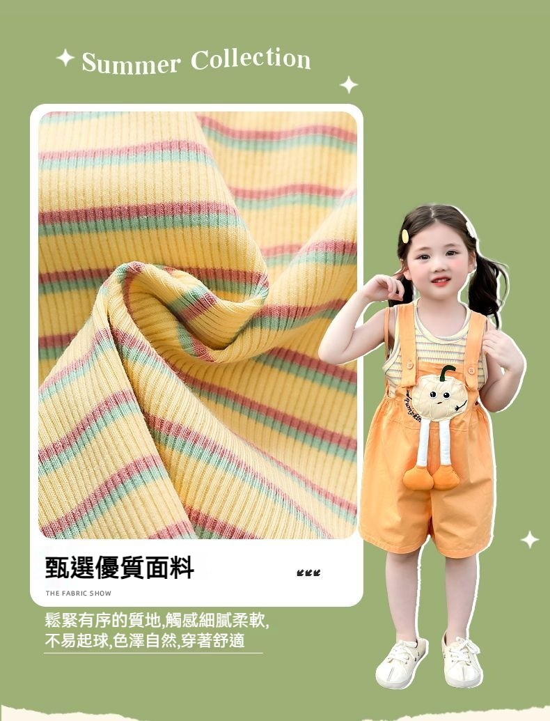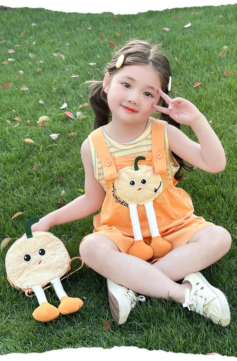 女孩夏裝可愛南瓜條紋上衣+背帶短褲+包包三件組