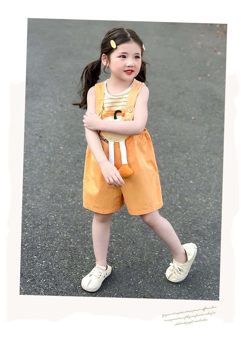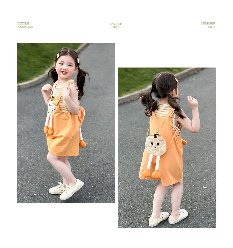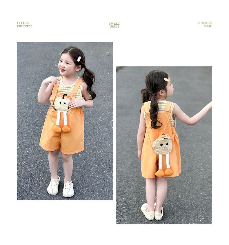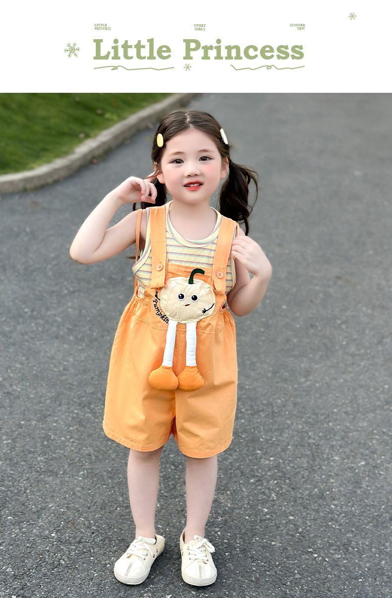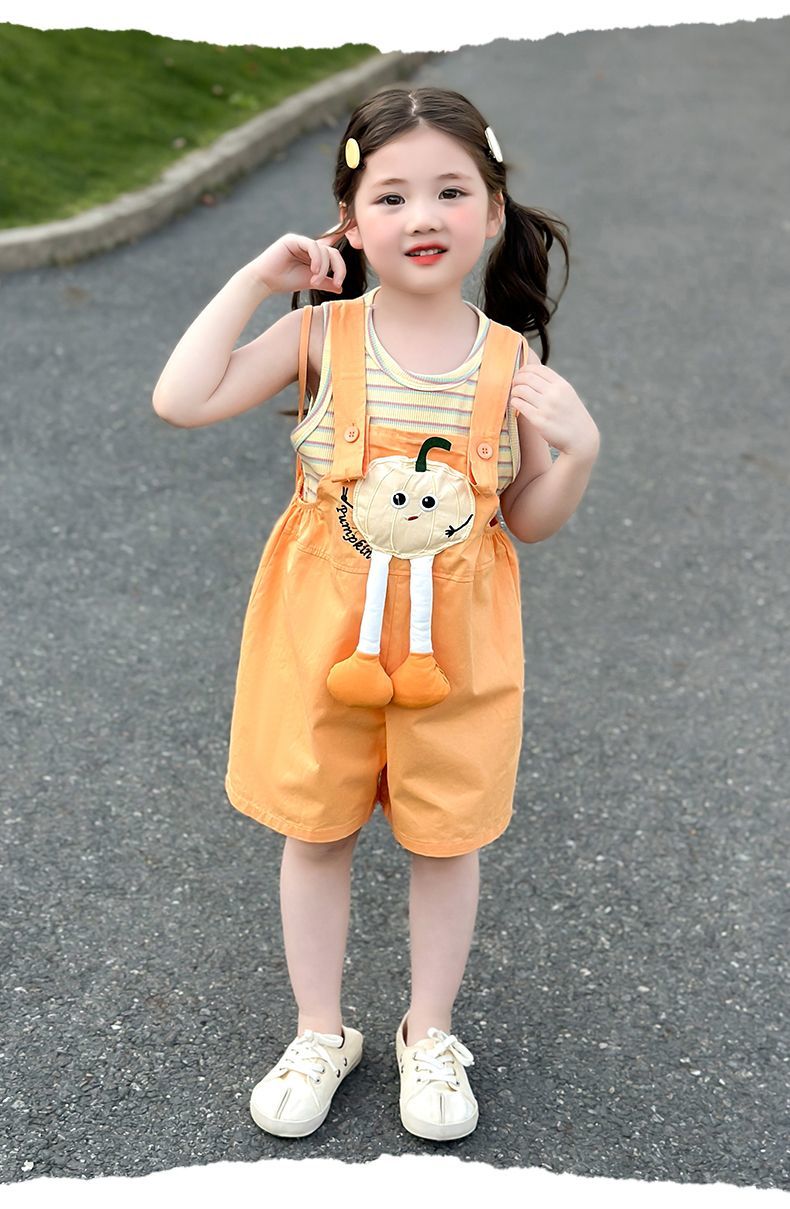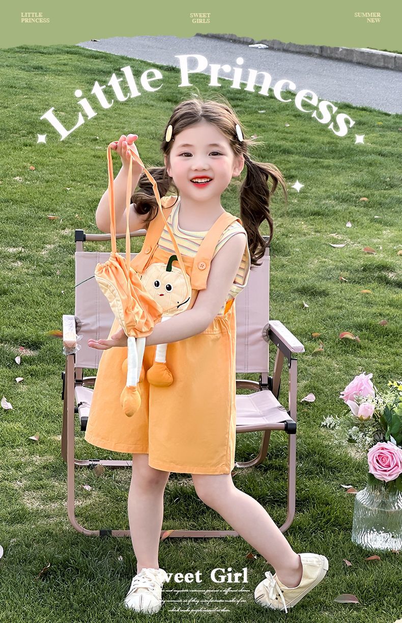 女孩夏裝可愛南瓜條紋上衣+背帶短褲+包包三件組
