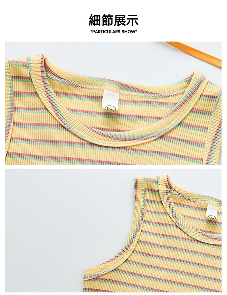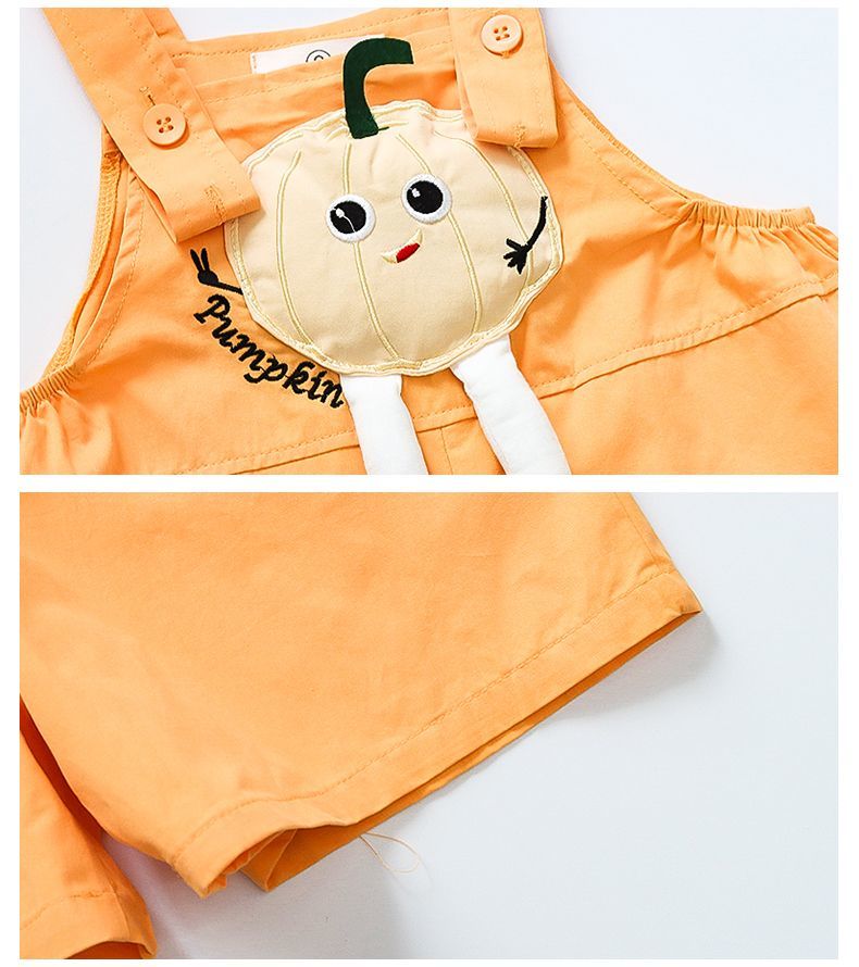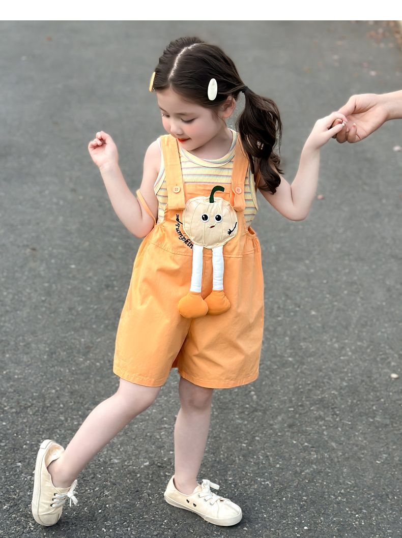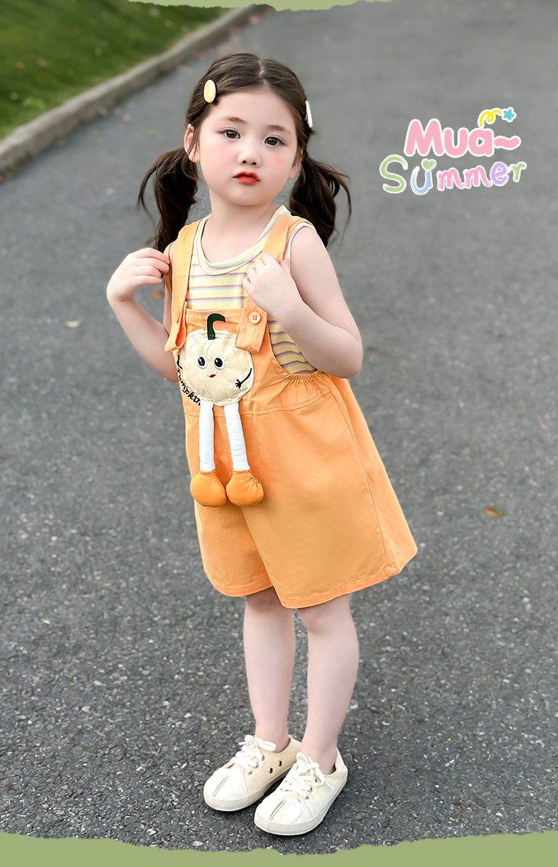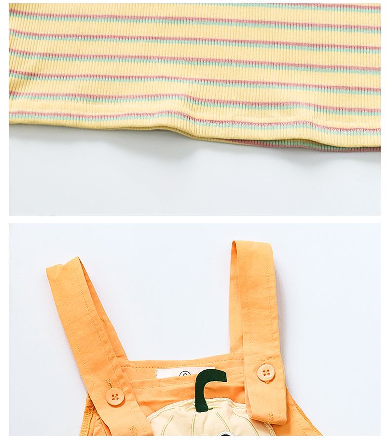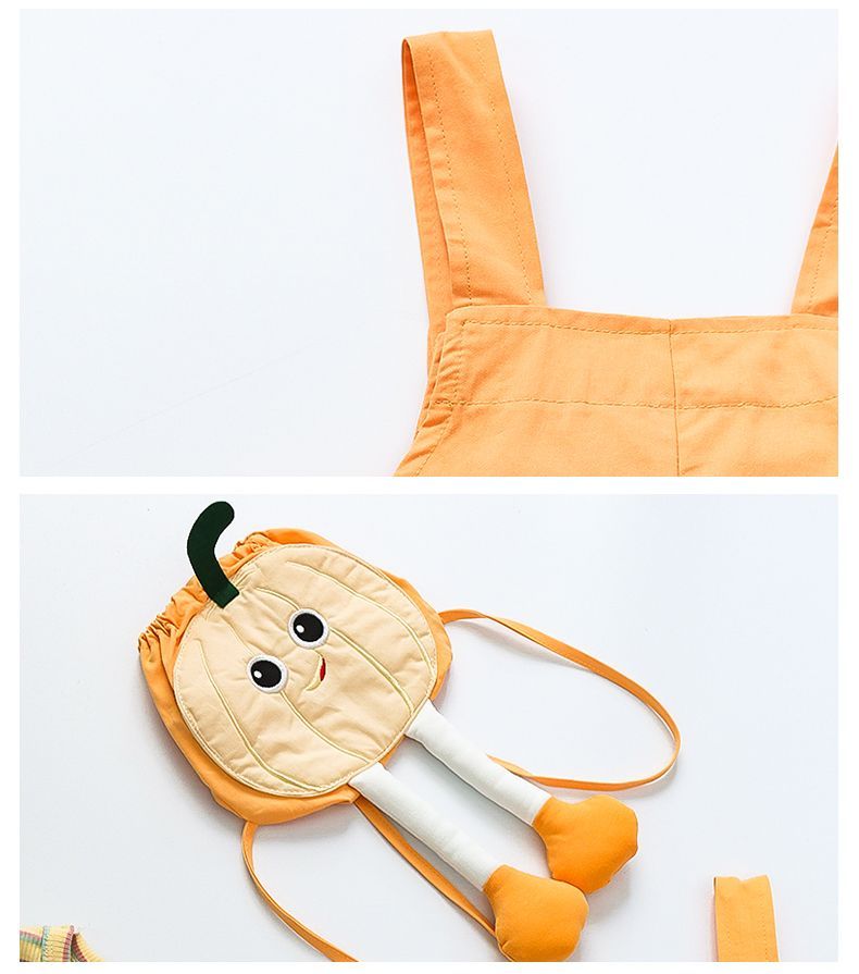 女孩夏裝可愛南瓜條紋上衣+背帶短褲+包包三件組
