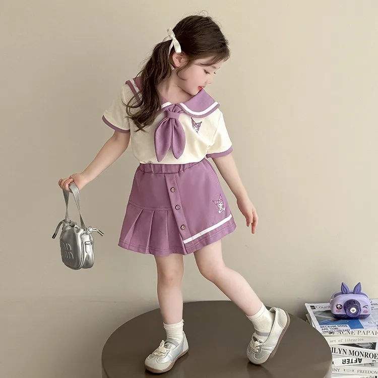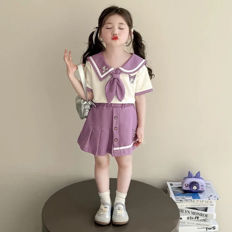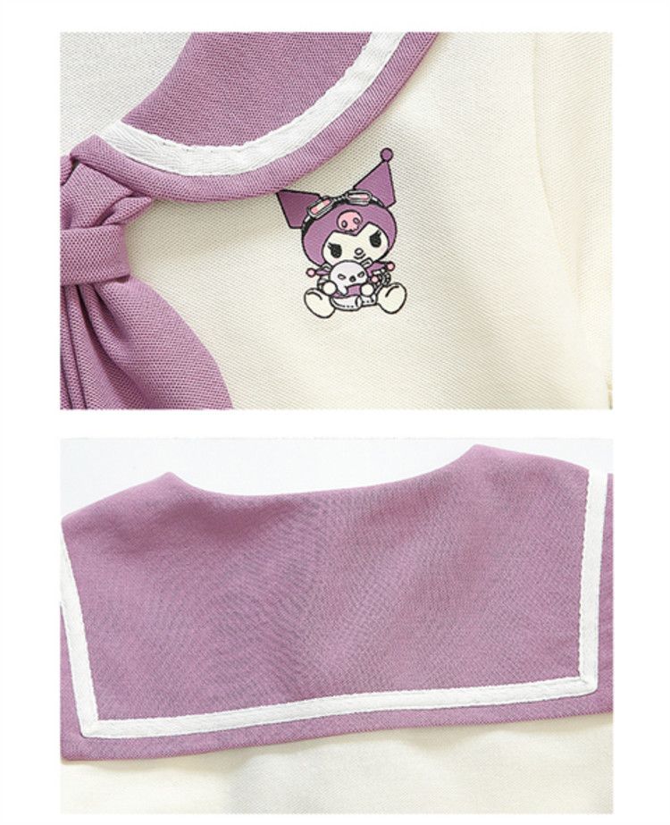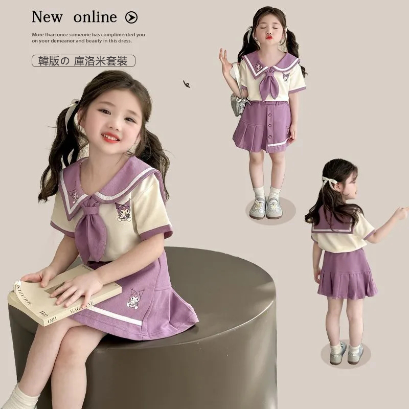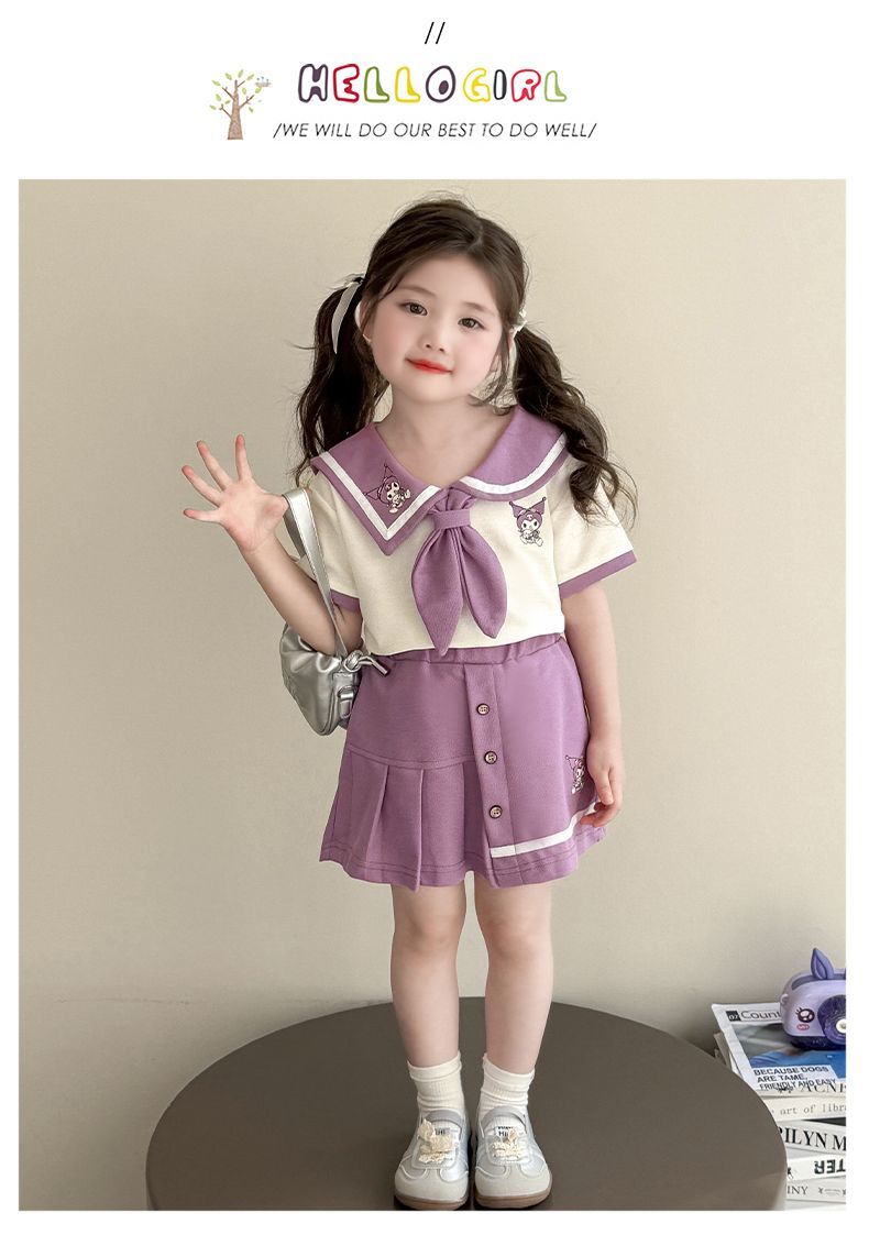 2025年新女童夏季學院風紫色庫洛米、粉色美樂蒂短袖上衣+褲裙+包包3件組,舒適時尚【贈送髮飾8件組】