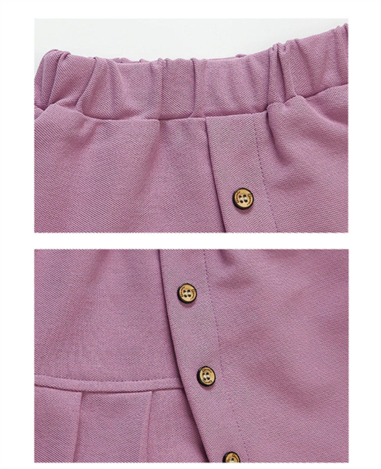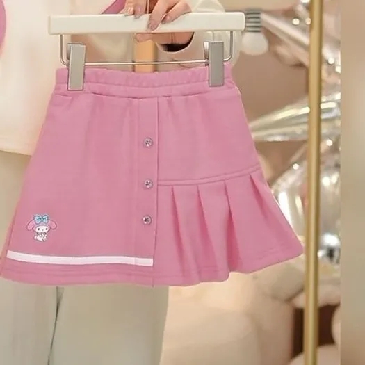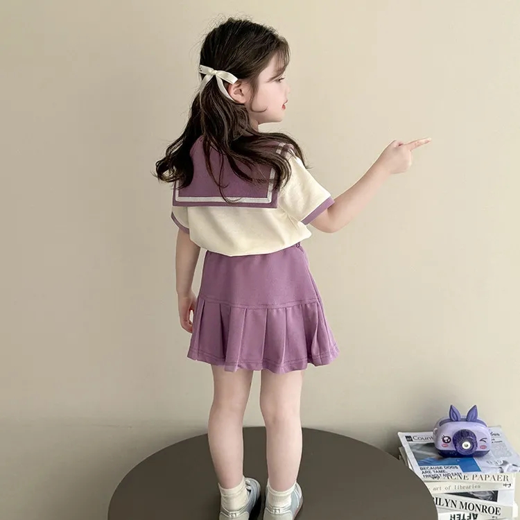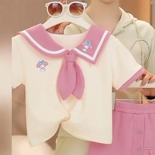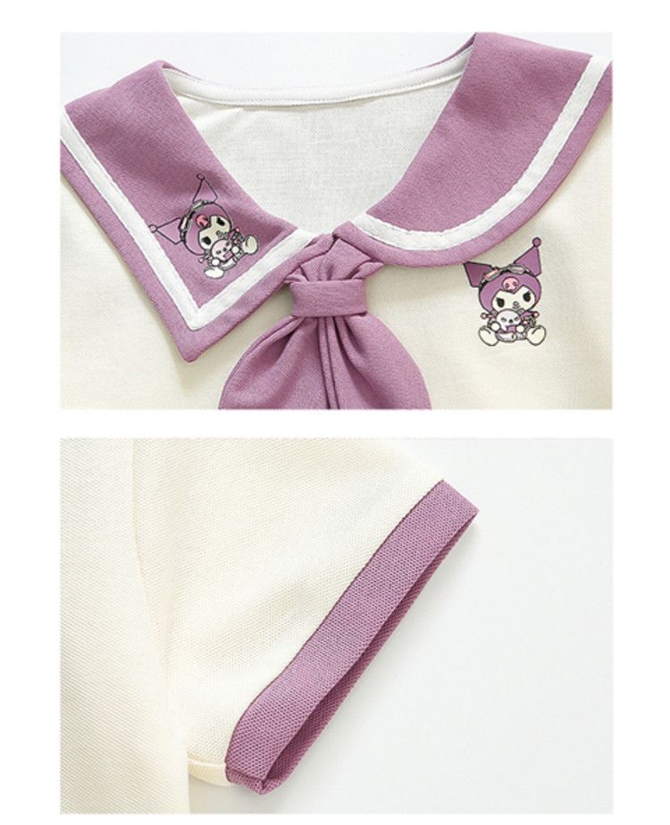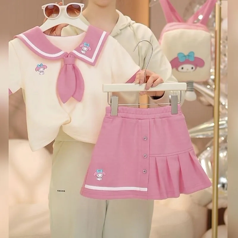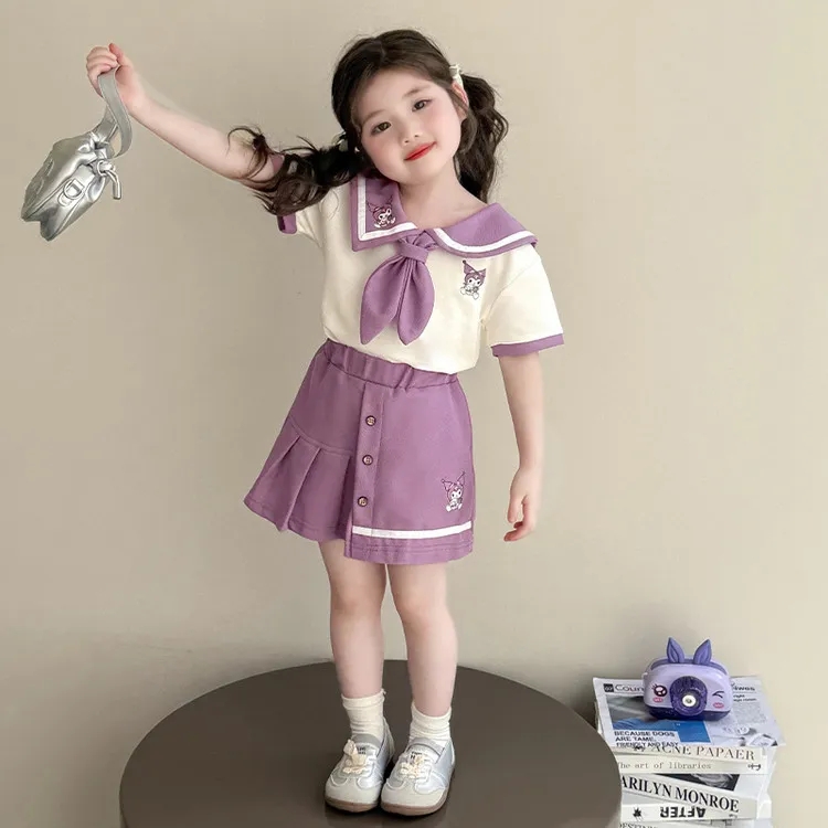 2025年新女童夏季學院風紫色庫洛米、粉色美樂蒂短袖上衣+褲裙+包包3件組,舒適時尚【贈送髮飾8件組】