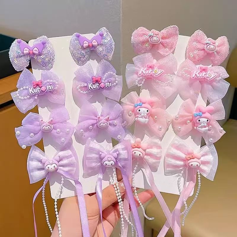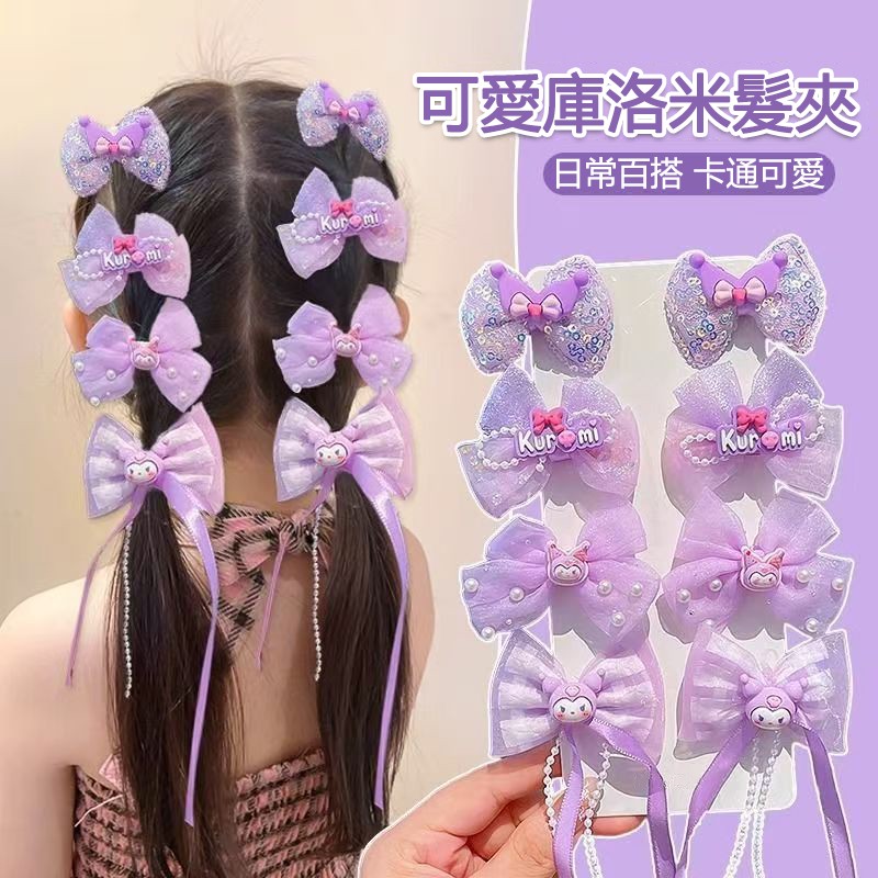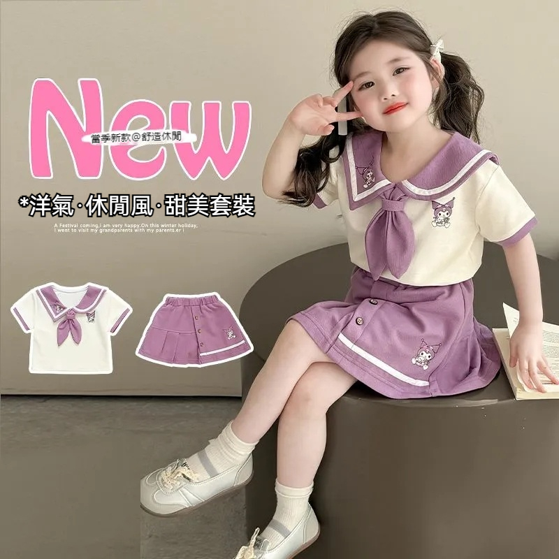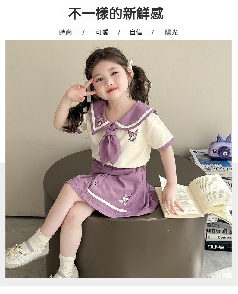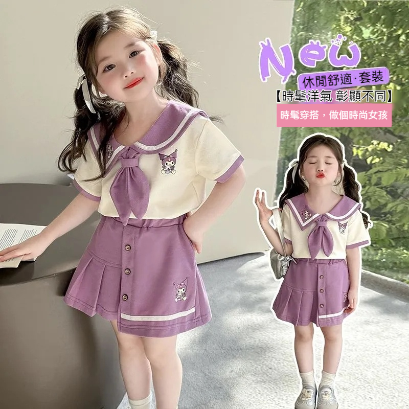 第 1 件 : 2025年新女童夏季學院風紫色庫洛米、粉色美樂蒂短袖上衣+褲裙+包包3件組,舒適時尚【贈送Kuromi髮飾8件組】